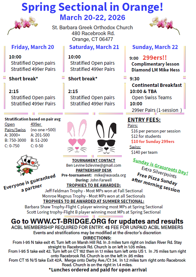 BBO games Saturdays & Sundays: Open game at 10:05. Look for Newtown [CT] under Virtual Clubs on BBO.